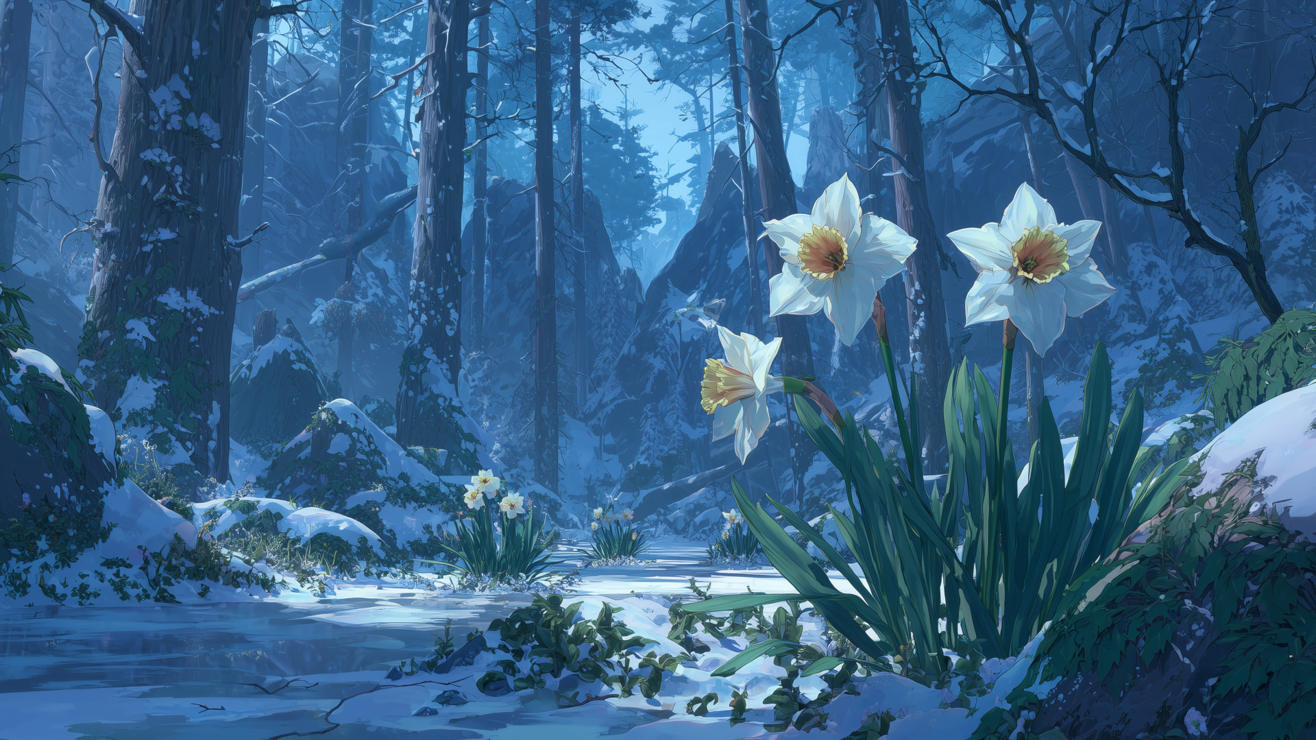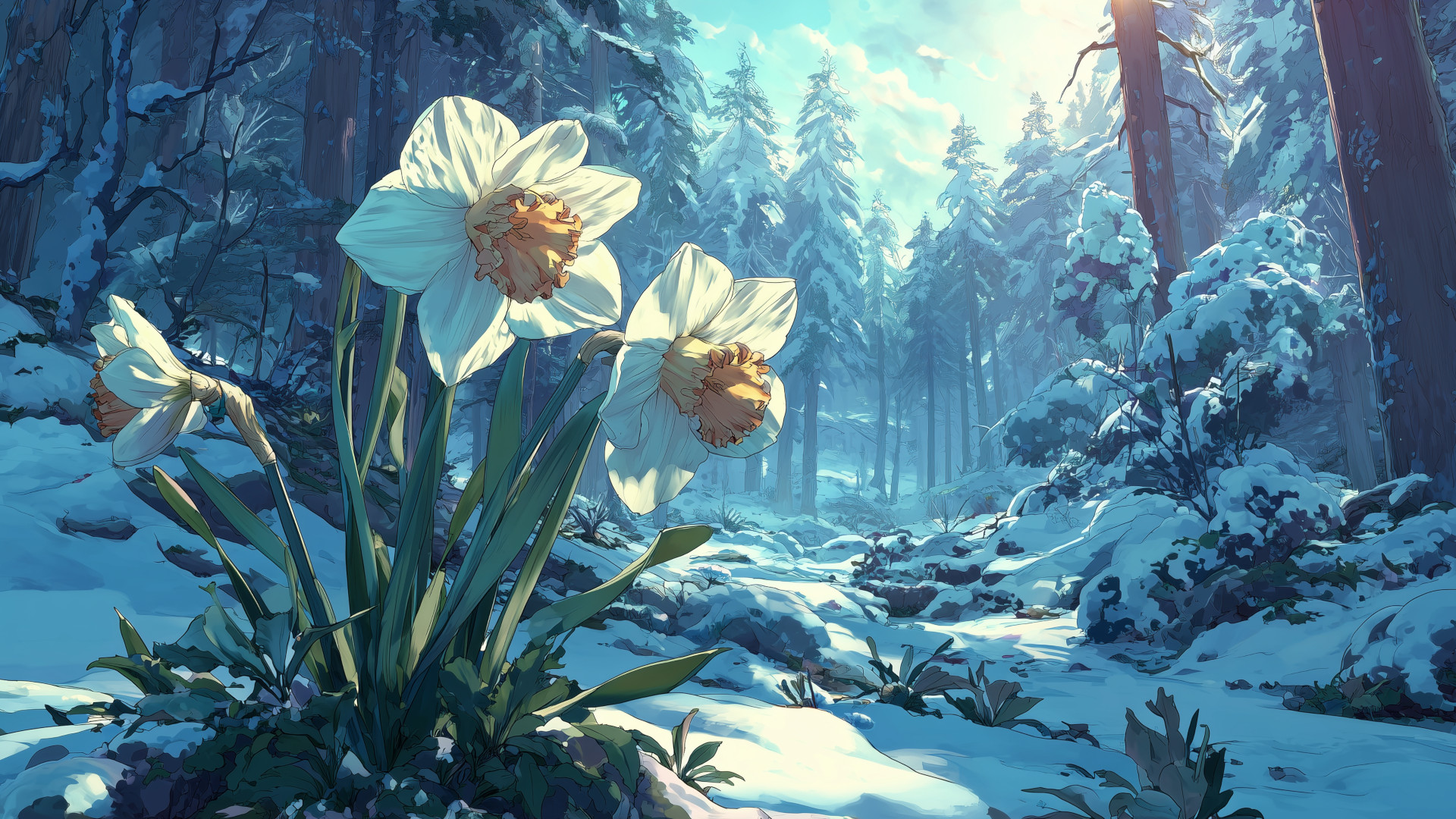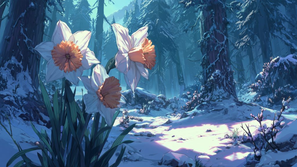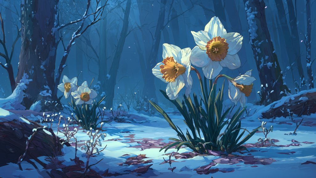 Keyword: daffodil, flower, forest, winter, background, illustration, free material