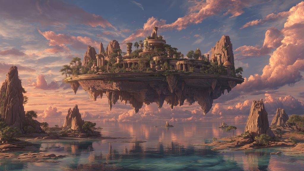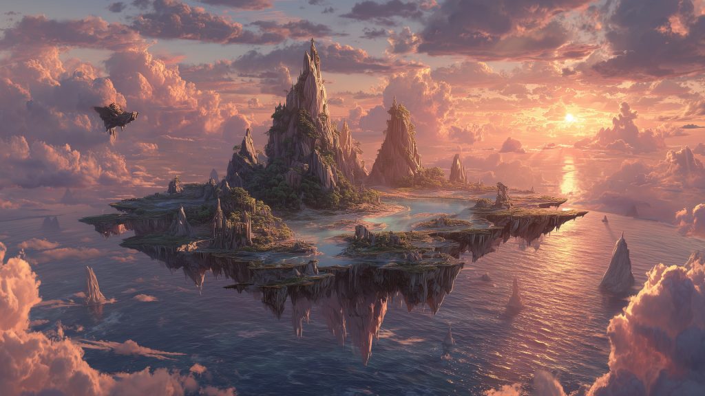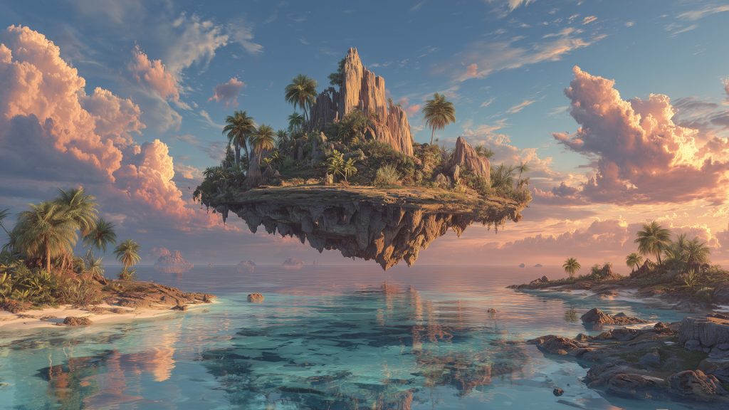 Keyword: floating island, morning, cloud, background, illustration, free material