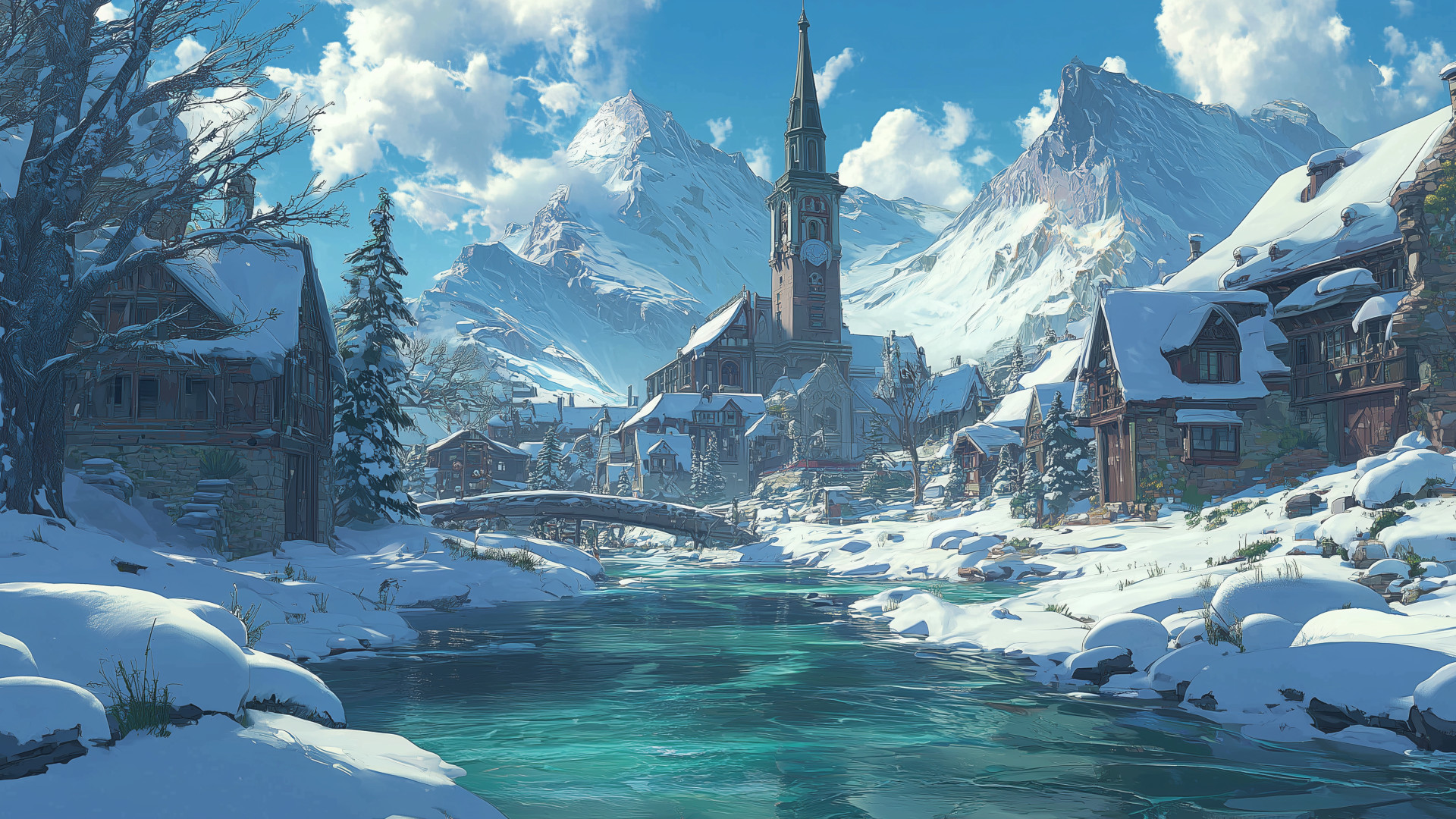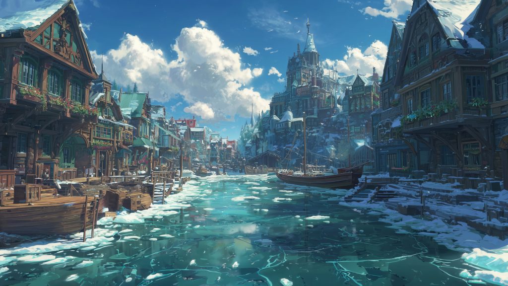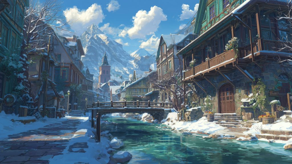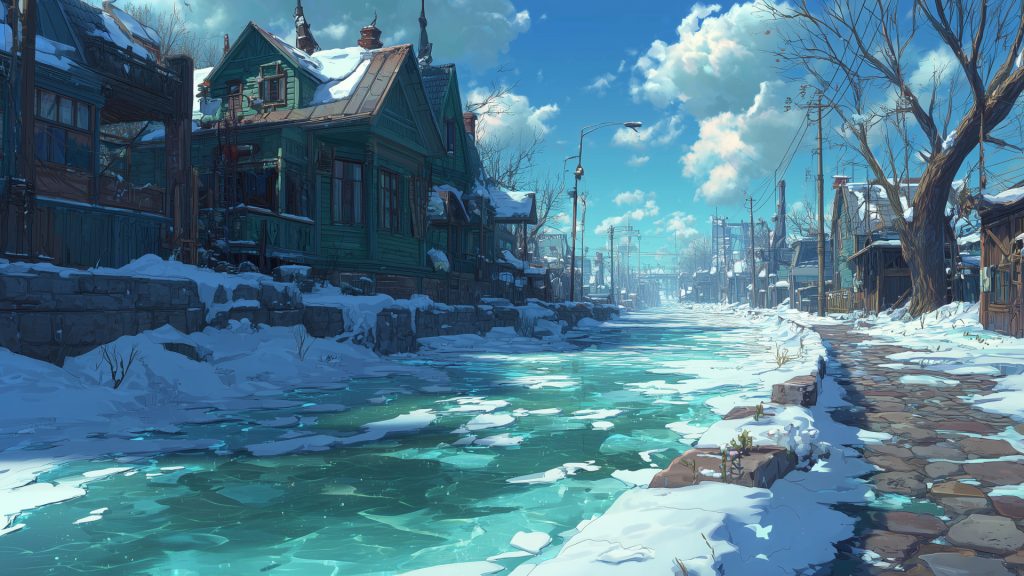 キーワード:川、村、雪、冬、背景、イラスト、フリー素材