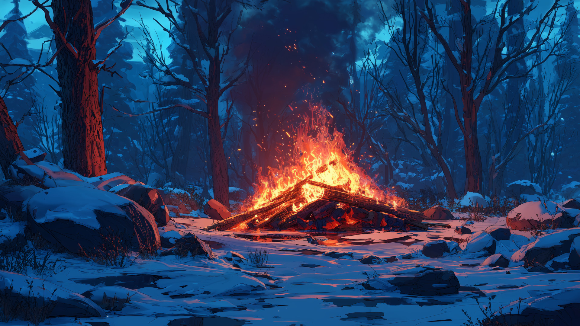 キーワード:キャンプファイヤー、雪森、冬、背景、イラスト、フリー素材